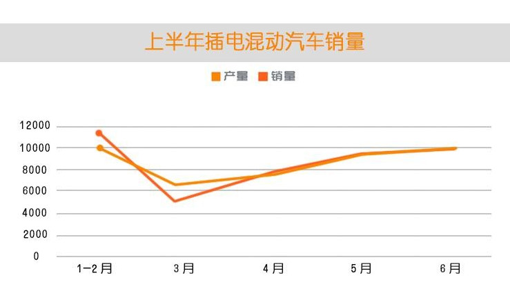 由圖可知純電動汽車的銷量在5月、6月明顯回升且有繼續增長的趨勢,而插電混動汽車雖有回升但增長不夠快,總體趨勢是增長的。