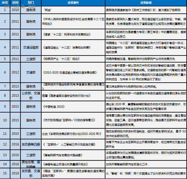 隨后,物聯網、車聯網相關措施陸續出臺,尤其是近2016年07月工信部《智能網聯汽車發展技術路線圖》基本完成,該路線圖將為行業發展提供清晰思路和方向,同時為相關政策和行業標準的推出奠定基礎。