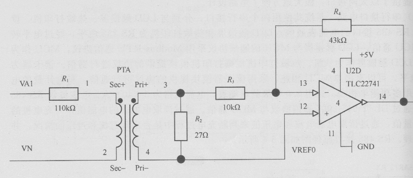 電壓測量首先需要通過測量互感器將電壓和電流轉換為可以測量的小信號。例如對220V的電壓信號的測量,采用的互感器變比為2mA/5mA,采用如圖所示的電路,可知在220V時互感器的輸出恰好為5mA。