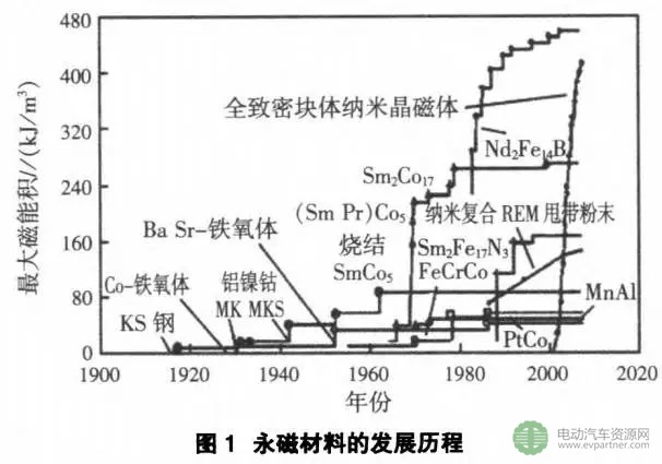 常用的主要種類有:鐵氧體永磁材料、鋁鎳鈷永磁材料和釹鐵硼稀土永磁材料等。永磁材料的發展歷程如圖1所示。