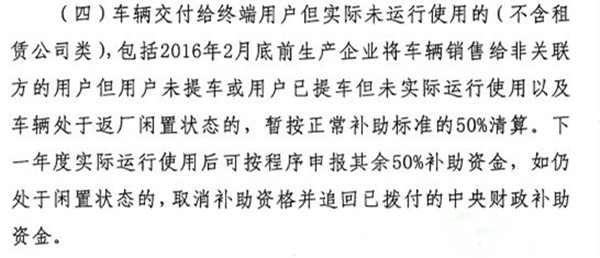 據(jù)此可以推測(cè),近日流傳出的“閑置車輛信息參考表”即為2016年9月專員辦檢查及各地方政府復(fù)查出的“閑置車輛”信息匯總。此番再次發(fā)布《關(guān)于報(bào)送2015年度新能源汽車閑置車輛情況的通知》,是要求對(duì)認(rèn)定為閑置情形的車輛運(yùn)行情況進(jìn)行核查確認(rèn)。而后,四部委會(huì)根據(jù)反饋信息形成終關(guān)于“閑置車輛”問(wèn)題的確定,并按照出售對(duì)象是關(guān)聯(lián)企業(yè)而非終端用戶且閑置的車輛不予以清算,對(duì)出售給非關(guān)聯(lián)用戶但處于閑置狀態(tài)的車輛按正常補(bǔ)助的50%進(jìn)行清算。
