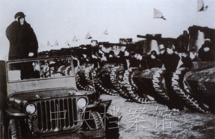 紀錄片:(群眾呼聲)中國人民萬歲!(紀錄片解說)檢閱開始了。東北野戰(zhàn)軍參謀長劉亞樓將軍,向毛主席報告受檢閱的部隊全部到齊。坦克塔上飄揚著紅旗,坦克手精神百倍,向著自己的領袖敬禮。